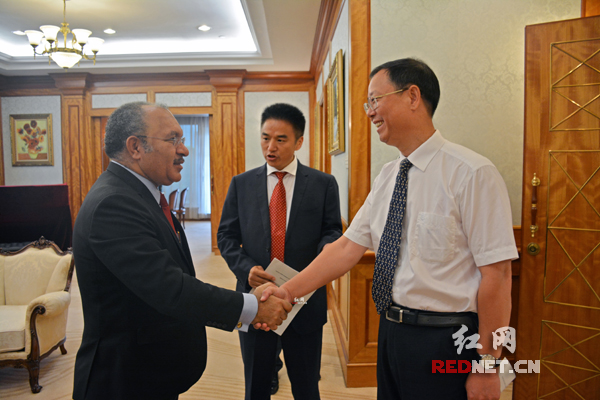 巴布亚新几内亚总理奥尼尔(左)接见湖南建工集团总经理周友文(右)。
