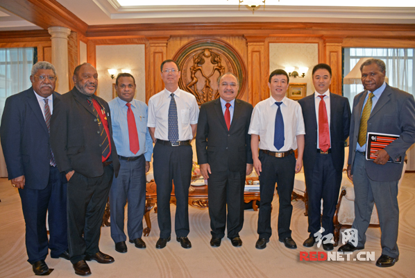 巴布亚新几内亚总理奥尼尔(右四)及代表团与湖南建工集团总经理周友文(左四)一行合影留念。