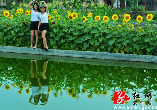 红网安仁站7月14日讯(通讯员 何炳文 何超)在湖南省安仁县农科所和渔场的100亩鱼塘上的相间土埂上,种植的向日葵正在竞相开放。那一垅垅、一行行又大又圆的葵花映在鱼塘水中的倒影,时隐时现,走进鱼塘葵花中,令人沉醉。