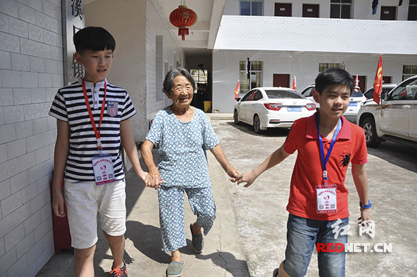 敬老院一位老奶奶被两名长沙麓山国际实验小学的小志愿者拉着手,幸福感爆棚。