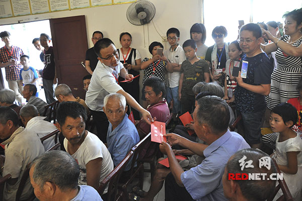 一位志愿者在给敬老院老人发放慰问金。