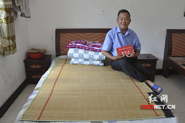 一名老人拿到慰问金回到宽敞明亮、整洁干净的敬老院房间内。