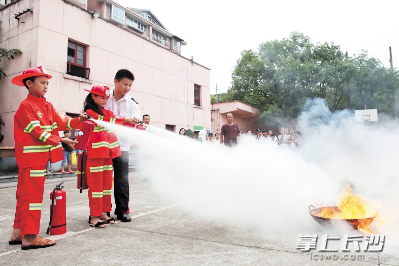 昨日,在芙蓉区韶光社区举行的青少年社会管理体验营上,孩子们学习灭火器使用等消防技能,提升自己的应急保护能力。长沙晚报记者 胡媛媛 通讯员 罗园 摄影报道