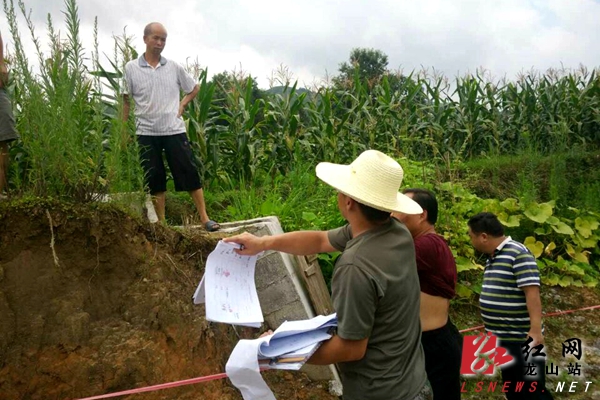 红网龙山站7月21日讯(通讯员 包海平 鲁军)7月21日,湖南省龙山县石羔水厂集中供水工程项目部技术员和石羔街道国土、林业等相关工作人员一道,在石羔街道旧寨村,进行石羔水厂水源管道建设征地测量及实物量登记工作。