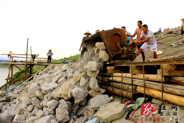 红网龙山站7月21日讯(通讯员 胡荣春)7月21日,湖南省龙山县里耶防洪大堤临酉水河面,工人们顶着炎炎烈日运送石料,对防洪大堤受损沉陷地段进行抛石护堤加固。