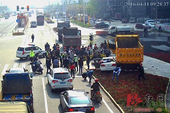 今年4月11日9时许,鼎城区许家桥乡兴旺冲村31岁男子陈某驾驶车牌为湘J280××的黄色豪运牌自卸货车行驶至鼎城区金霞路与阳明路交会处时,因其驾驶车辆私自安装后射灯存在交通违法行为,被正在此处执勤的鼎城区公安局交警大队民警查获并开具简易处罚决定书处以罚款200元。陈某不服从处罚拒绝签字,且与执法民警发生争执,并扬言要撞执法警车。尔后,陈某进入其自卸货车驾驶室,发动车辆挂入倒挡,倒行撞向停在自卸货车后面的执法警车。该警车被撞击时有一名民警正坐在车内,警车被撞击后车身顺时针旋转90度并发生短距离滑行,警车在旋转、滑行过程中将站在警车左侧的一名协撞翻在地,同时将正在警车左侧尾部一名接受违法处罚的司机撞倒并卷入车底,造成2人不同程度受伤,警车严重毁损。