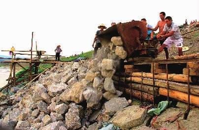 7月21日,里耶古城防洪大堤临酉水河面,工人们运送石料对防洪大堤受损沉陷地段抛石护堤加固。“6·20”里耶古城特大洪灾,造成防洪大堤多处受损。连日来,龙山县各级政府部门抽调精兵强将、专业技术人员昼夜施工,整修防洪大堤。
