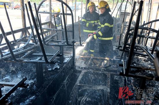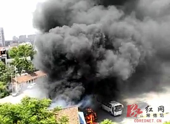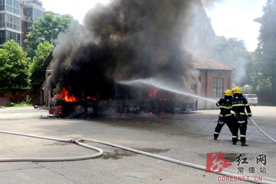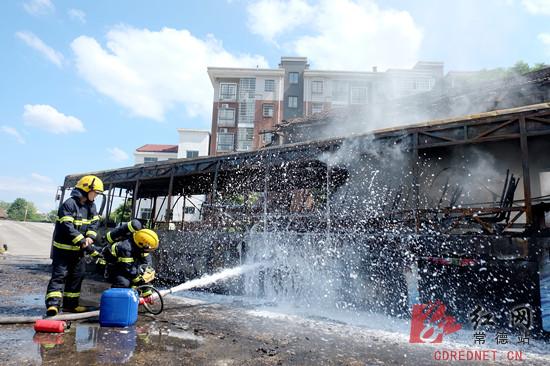常德消防支队指挥中心接到报警后,立即调派武陵中队2台水罐车14名官兵赶赴现场。官兵到达现场后发现,公交车火势处于猛烈燃烧状态,起火点四周是居民楼,不远处还有一个油库,火势有向四周蔓延的趋势。中队指挥员立即下令二班单干线出两支水枪进行夹攻控制火势蔓延,一班协助二班出一支泡沫水枪进行灭火,其余人员负责警戒。