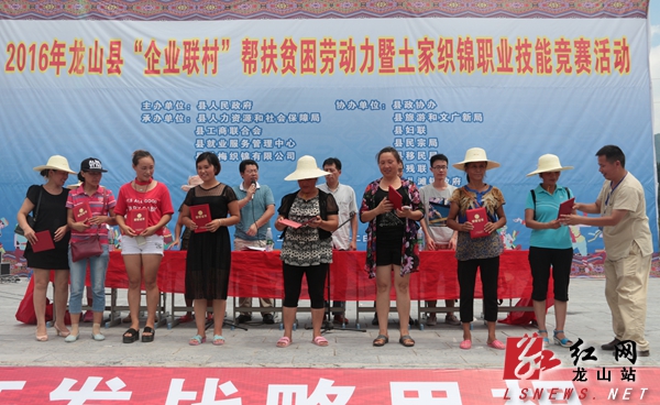 竞赛结束后,按实操和理论相结合,由土家织锦资深教师进行现场阅卷。县就业局当场对综合排名前20名优秀选手颁发了荣誉证书,每人奖励现金200元,并对总分排名前40名且属于建档立卡贫困户的参赛选手每人赠送一台织锦机。