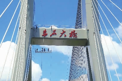 7月28日,宜章县赤石乡厦蓉(厦门至成都)高速公路赤石大桥,工人们顶着高温在近300米的高空进行涂装作业。赤石大桥是厦蓉高速湖南汝郴段的控制性工程,是世界第一大跨径高墩多塔混凝土斜拉桥。大桥计划10月建成通车。