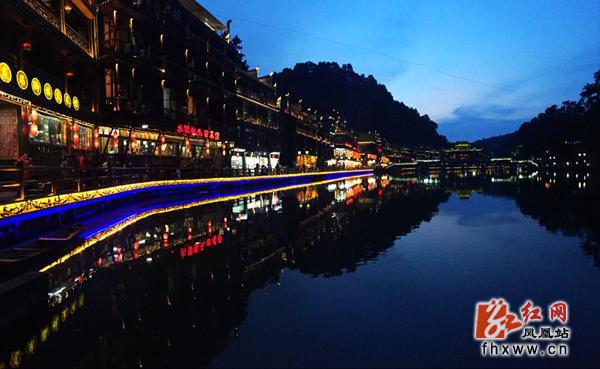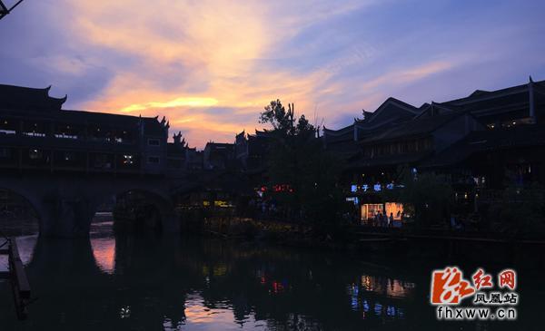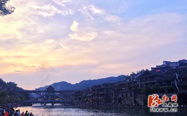 红网凤凰站8月3日讯(分站记者 龙珍)“落日绣帘卷,亭下水连空”,8月1日,湖南省凤凰古城晚霞如锦,美妙绝伦,进入夜色中的古城暮色弥漫,静静的是那么的平静,让人不忍心去打破这静静的美。