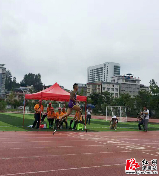 湖南省保靖县运动员曾维高脚竞速夺冠冲刺瞬间 黄钊江 摄(手机拍摄)
