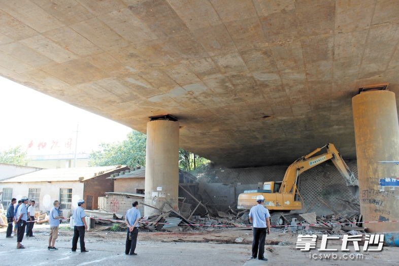 近日,天心区黑石铺街道联合公安、交运、城管等部门,对长沙绕城高速西南段黑石铺大桥下的违法搭建及乱圈乱占、乱堆乱放等行为进行集中整治,拆除违法建筑近500平方米,黑石铺大桥下恢复了原来干净整洁的面貌。 长沙晚报记者 卜劲文 通讯员 彭文杰 摄影报道