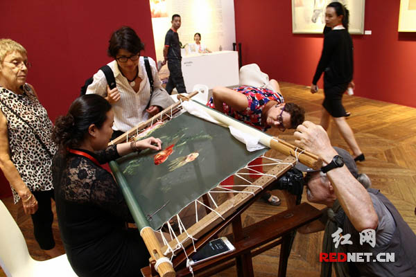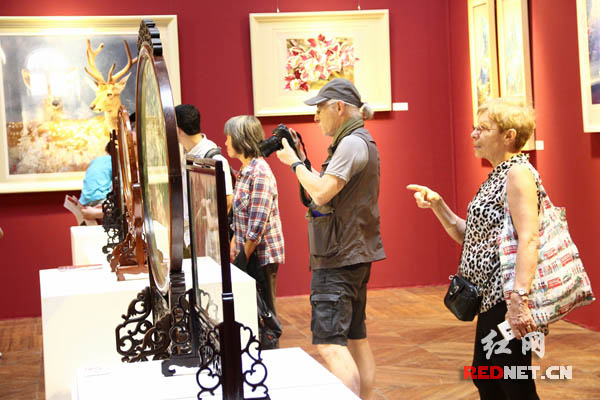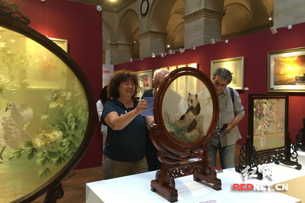 来自法国巴黎的Joelle Durieux女士对湘绣十分感兴趣,特别是《熊猫·老虎》。她告诉记者,实在无法理解如何在一张真丝底料上绣出两种图案,简直太神奇了,她称赞道“Oh!C'est de la magie!”(魔术般的艺术)。而真丝缎单面绣挂屏《母爱—梅花鹿》、《卡兰特》也受到了法国观众的喜爱,被法国观众称“作鹿好像要走下来,花好像真的在开放”。