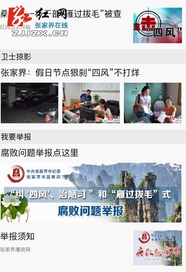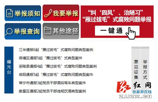 一、您可以登录张家界廉政网(http://www.zjjlz.gov.cn/Index.html),点击“纠‘四风’、治陋习”“雁过拔毛”式腐败问题举报一键通专栏,按相关提示进行操作,一键直通市纪委。