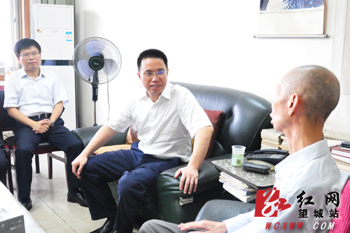 望城区委书记孔玉成(中)与退休教师左承植交流。高亮 摄