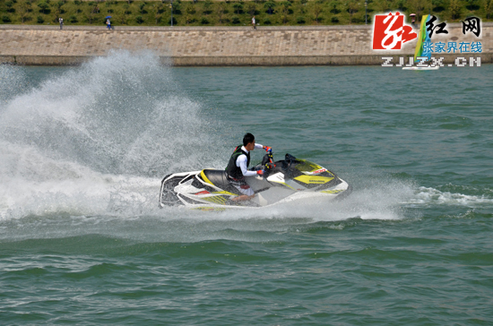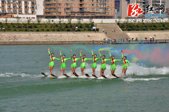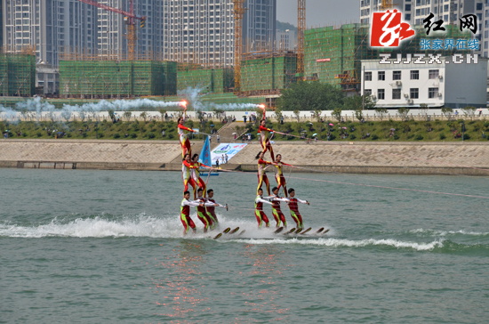 在水上飞人表演之后,是绕船360度表演,难度系数很大,一开始是双人绕,紧接着就是四人绕船360度,其惊险让现场观众直呼心脏受不了。接下来的表演精彩纷呈,立式摩托艇表演互动感强;水上芭蕾赏心悦目;摩托艇编队表演协调一致;水上叠罗汉场面震撼轰动;腾空椅绚丽夺目。不过,最刺激的还是摩托艇PK赛与F4中国方程式PK赛,在机械的轰鸣中,摩托艇像离弦之箭飞快射出,掀起雪一样的浪花,在澧水河中你追我赶,让人心潮澎湃。