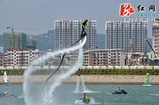 当天开幕式后,首先是运动员的入场式,坐着摩托艇、滑水艇等各式水上运动器材的运动员打着横幅或旗帜入场向观众致意。紧接着开始就是最为炫目的水上飞人表演,在动感的音乐背景衬托下,表演者时而空中漫步、时而转体空翻、时而鱼跃入水,迅速点燃了观看市民的热情,引发阵阵欢呼。
