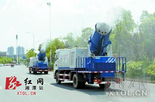 9月13日,两台雾炮车在雨湖区建设北路喷雾作业。湘潭日报记者 王希台 摄影