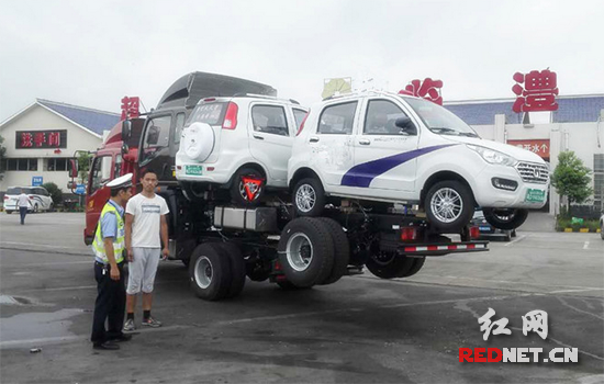 当日15时20分,常德高速交警巡逻至二广高速临澧服务区时,发现一辆重型半挂牵引车,拖了另一辆重型半挂牵引车、两辆小车,停在服务区内。民警立即上前查看,发现载货的重型半挂牵引车为新车。驾驶员为了防止后车追尾,还特意在货物上用铁丝捆绑了一个三角标志牌。经询问,驾驶员从湖北过来,开往常德,为了节省过路费、油费,就采取这种“叠罗汉”的方式运送车辆。