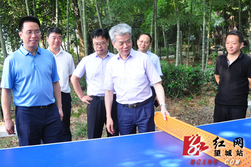 湖南省长沙市委常委、宣传部长张湘涛(中)察看彩陶源村的体育健身设施。高亮 摄