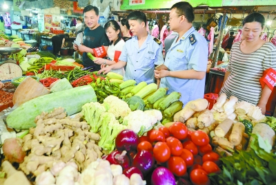 9月21日,食品安全综合执法队员在长沙浏城桥农贸市场进行突查。当天,长沙市芙蓉区文艺路街道联合区工商所、城管办、食药局稽查大队等10多个部门开展农贸市场整治专项行动,对辖区农贸市场环境卫生、开办方食品安全主体责任落实情况、现场制售门店资质资格等进行全方位集中整治。湖南日报记者 徐行 摄
