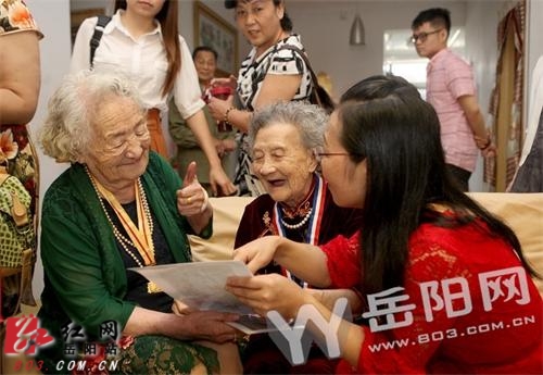 红网岳阳站9月23日讯(分站记者 王志)9月22日,来自湖北、湖南的抗战老兵、岳阳市人大、政协、统战部的代表及湖南老兵之家、岳阳市大德志愿者协会共两百多人欢聚岳阳,为抗战老兵田蕴玉女士庆贺百岁生日。