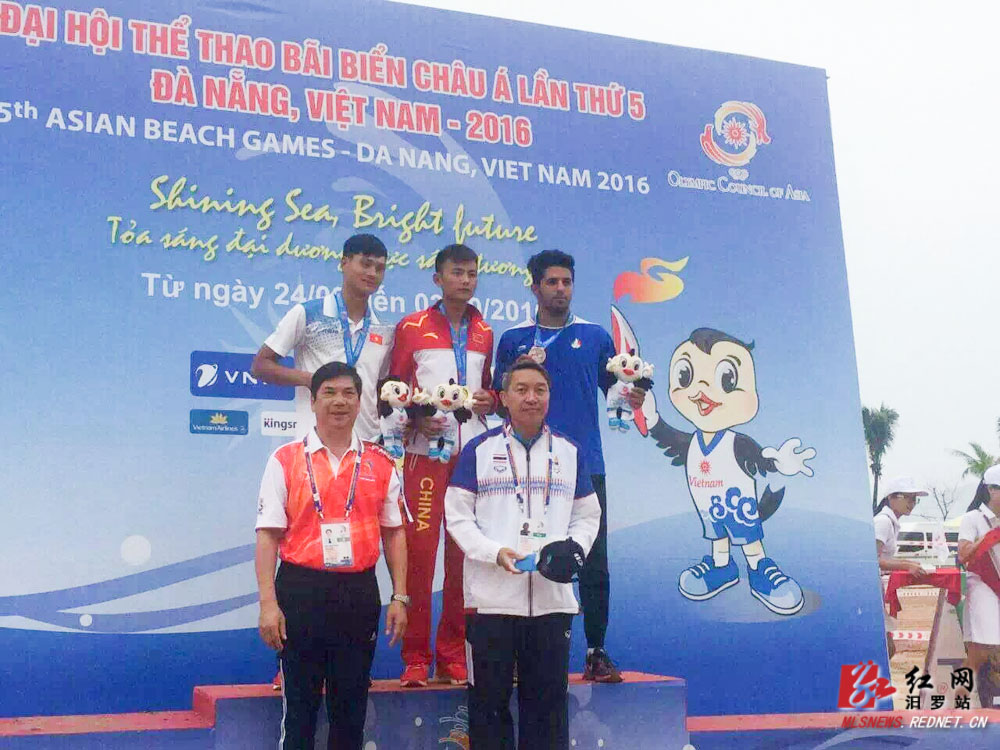 红网汨罗站9月27日讯(分站记者 杨莎莎)第五届亚洲沙滩运动会9月24日在越南中部的岘港市开幕,湖南省汨罗籍运动员钟沛丰带伤参加9月26日举行的男子沙滩跳远比赛,以7.53米的成绩获得金牌。