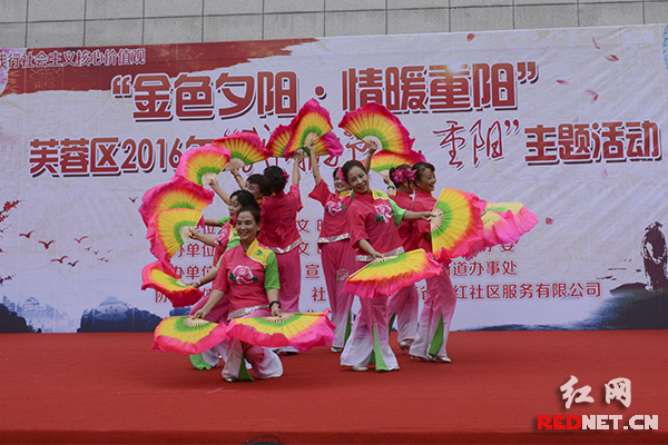 9月28日上午,长沙五里牌街道举办重阳节主题活动。图为五里牌街道联合湖南省吉红社区服务有限公司成立的五里牌吉红俏夕阳老年艺术团演员在表演。