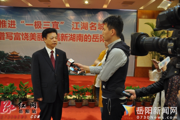 新任湖南省岳阳市委书记盛荣华(左)接受省市媒体采访现场
