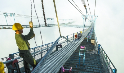 10月3日,岳阳市洞庭湖畔,建设中的大岳高速洞庭湖大桥施工现场,湖南路桥集团工人在200多米高空架设主缆。国庆节期间,有400多名大桥建设者坚守岗位,抢抓工期,争取11月底完成主缆架设工程。