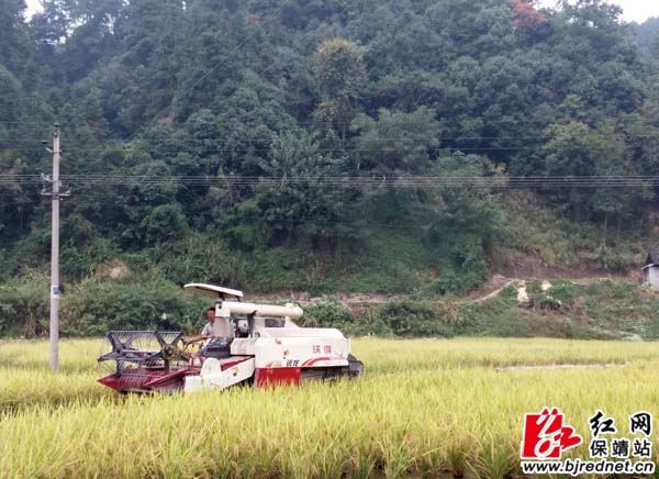 收割机在收割稻谷