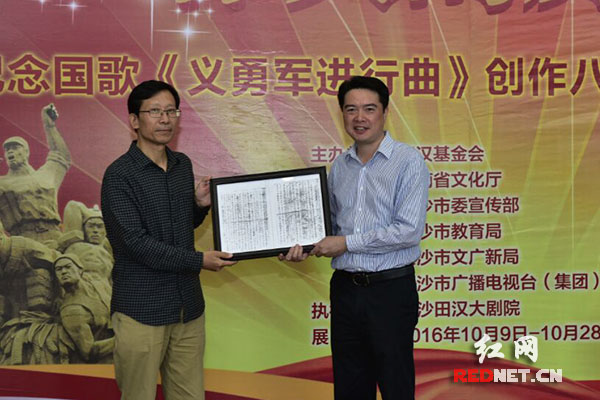 国歌图片巡回展开幕式上,中国田汉研究会向长沙田汉大剧院赠送国歌《义勇军进行曲》手稿复印件。