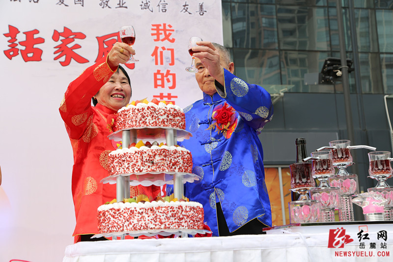 首届“长沙市十大孝星特别奖”徐国斌夫妇代表所有金婚夫妇倒香槟塔、切蛋糕,并和其他21对金婚夫妇举杯同饮,完成了浪漫神圣的庆典仪式