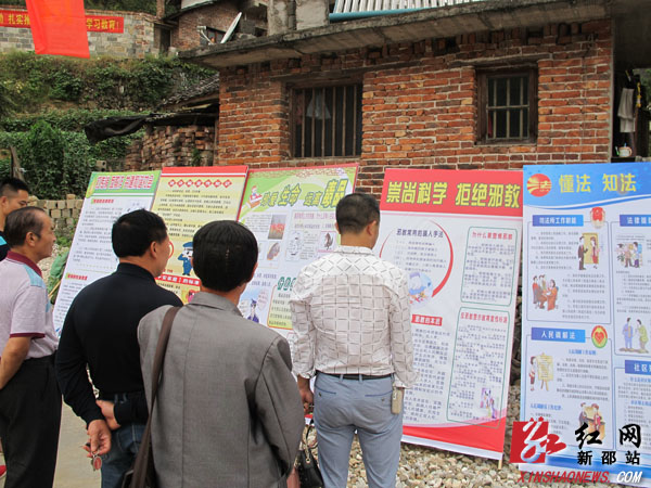 村民在观看普法宣传展板
