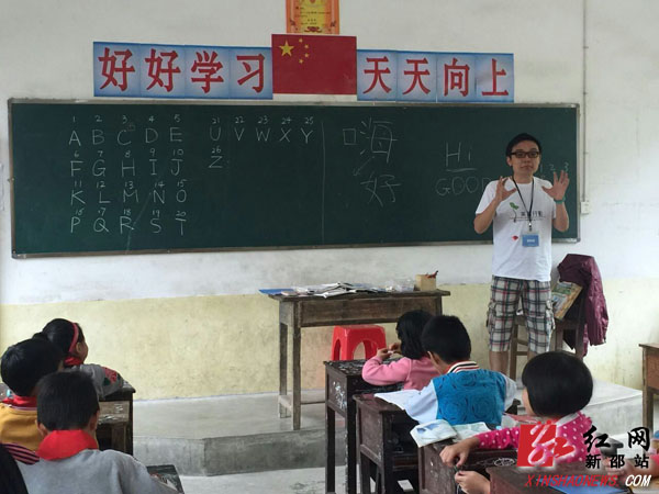新邵巨口铺镇高家坳完小因洪灾导致校舍变成危房,通过香港“源”慈善基金的牵线搭桥,隆堡国际酒店捐资26万元,加上新邵县自筹90.8万元,将学校重新兴建。近三年来,“源”慈善基金每年都派志愿者来看望学生,并捐资捐物助学。在10月9日的活动现场,义工们利用精美的英语教学图册教孩子们学习有关身体部位和常见动物的英语名词,通过图片涂鸦的方式巩固所学知识。课间休息时,学生们亲密地和志愿者们一起做游戏,欢乐的互动营造了积极的学习氛围,将整个英语教学活动推向了高潮。