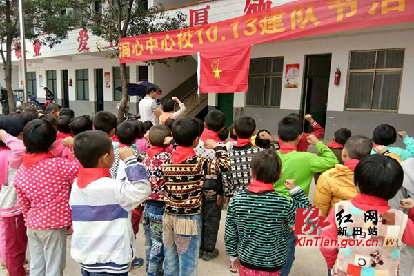 红网新田县分站10月15日讯(分站记者 钟伟锋 通讯员 李德富)“我是中国少年先锋队队员。我在队旗下宣誓:我热爱中国共产党,热爱祖国,热爱人民,好好学习,好好锻炼,准备着:为共产主义事业贡献力量。”10月13日,湖南省新田县洞心中心校庆祝建队节活动上,一年级新生举起右手面向队旗誓言。
