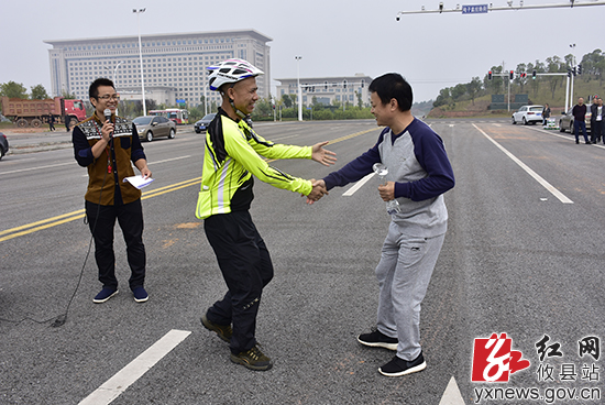 攸县文体广新局局长文志辉(右)为自行车比赛第一名获得者颁奖。
