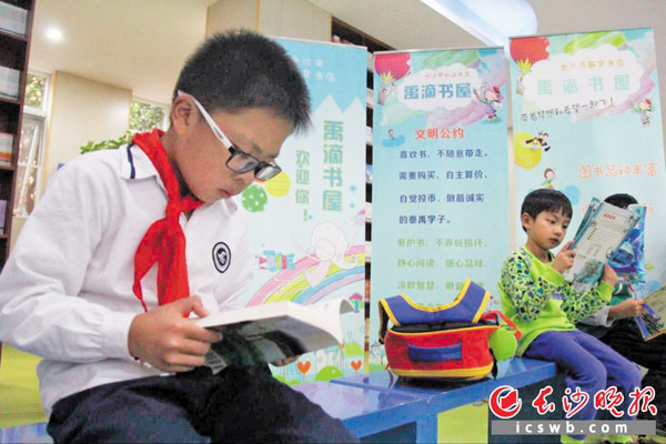 长沙晚报讯(通讯员 石慧琼 记者 李卓)看上哪本书,自己算折扣,折后购书款自觉投进收款箱,全程无人监管只靠自觉。昨日,湖南首家校园诚信书店“禹滴书屋”在雨花区圭塘街道辖区内的泰禹小学开张,孩子们在无人看管的情况下自由看书、买书、付款,培养诚信品质。