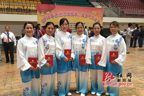 红网新田县分站10月18日讯(分站记者 钟伟锋 通讯员 罗芳旺)10月15日,2016年湖南省永州市太极拳、健身气功比赛在江永举行。全市各县区的11支队伍,120名太极拳和健身爱好者参赛。新田太极拳代表队在比赛中奋力拼搏夺得集体一等奖和五个单项第一名。