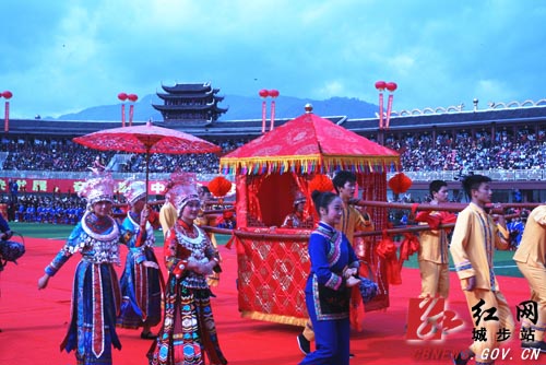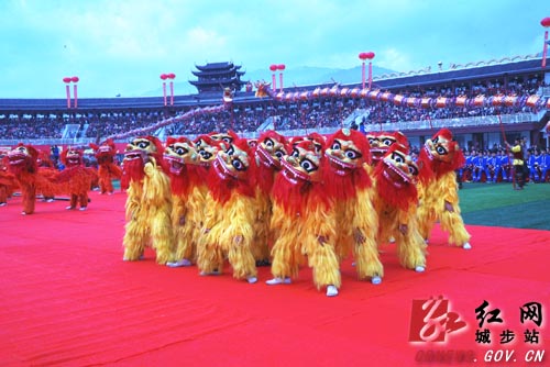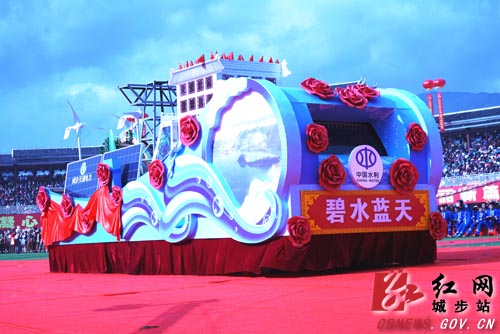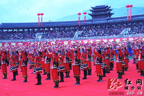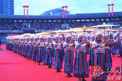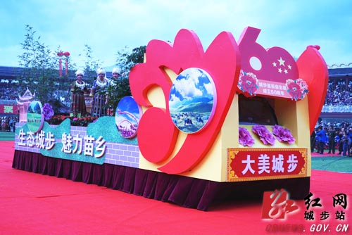庆祝大会上,热情好客、勤劳智慧的城步人民用独特的入场仪式欢迎各级领导嘉宾,并向来宾展示苗乡六十年的山乡巨变和辉煌成就。以苗乡吊龙、芦笙、山歌为代表组成的文化方阵率先入场,用绚丽多彩的城步特色文化展示着30万苗乡儿女如今生活的幸福喜悦;代表希望篇的“大美城步”“龙腾祥云”“多彩苗乡”“碧水蓝天”“振兴乐章”“千秋大业”六台彩车方阵则集中展示了苗乡城步六十年来在城镇建设、生态旅游、交通发展、生态农业、特色产业、风力发电、新型工业、文化教育等方面取得的喜人成绩。表达希望篇的青少年方阵、财税方阵、金融方阵、卫生方阵、民生方阵、民族方阵最后闪亮登场,向现场来宾展示着城步各族同胞对全面小康建设和城步未来的憧憬和期望。