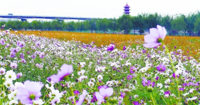 时刻新闻 —分享— 10月29日,安乡县城松滋河畔百亩花海,成片的波斯菊、硫华菊竞相绽放,娇艳欲滴,与一旁的宝塔、大桥、垂柳、河水共同构成了一幅美丽画卷。 湖南日报记者 徐行 摄 来源:湖南日报 编辑:王娉娉