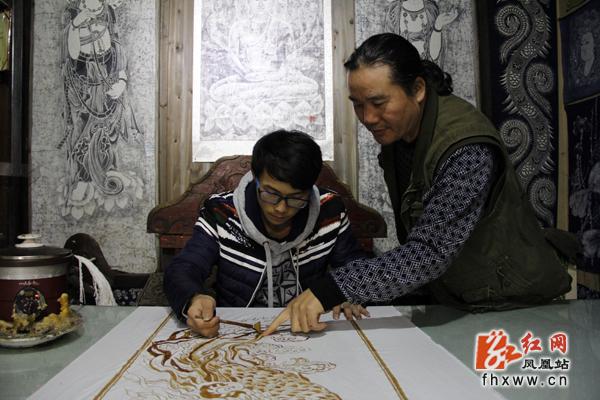 游客在王曜的指导下体验蜡染创作。