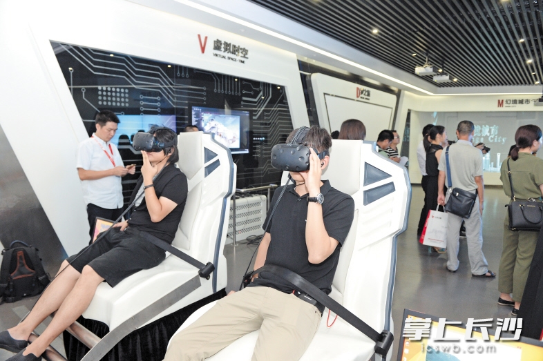 在长沙高新区华凯创意展示区,两位市民正在进行VR实景体验。长沙晚报记者 邹麟 摄