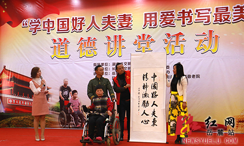 活动现场,全国道德模范、敬老院名誉院长廖月娥讲述了好人夫妻的善行善事。据介绍,谢芳和谢海华是岳麓区坪塘街道新合村的一对患难夫妇,1998年2月7日晚,年仅23岁的谢芳因勇斗歹徒身中9刀。由于未得到及时输血和相关康复治疗,四肢出现肌肉萎缩,不久就彻底丧失了行走能力,瘫痪在床已近27年。2012年,谢芳因勇斗歹徒荣登“中国好人榜”,当选“见义勇为好人”。那时,刚刚复员返乡的谢海华对眼前这个勇敢的女孩一见钟情,他不顾家人亲友的反对,用爱的承诺陪伴谢芳走过了28年。2016年,谢海华也荣登“中国好人榜”,获评“孝老爱亲好人”。