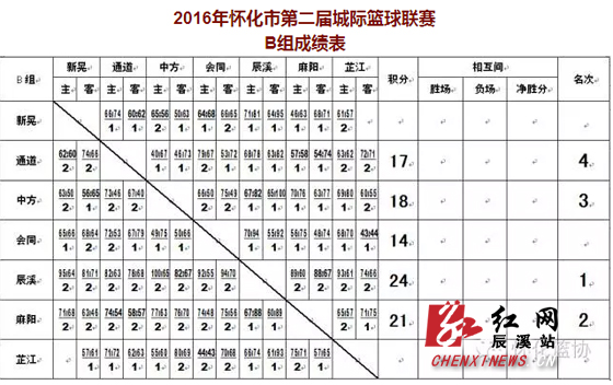 2016年怀化市第二届城际篮球联赛B组成绩表,辰溪队获全胜