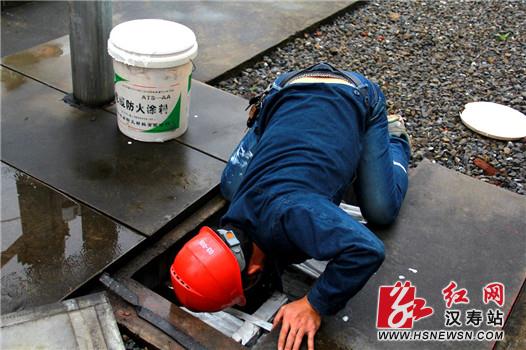 湖南省汉寿县供电公司工作人员在110千伏岩汪湖变电站内为电缆涂刷防火涂料