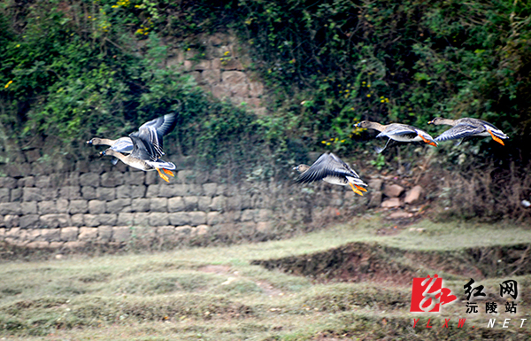 红网沅陵县分站11月30日讯(通讯员 瞿宏红)11月28日, 湖南省沅陵县五强溪国家湿地公园管理处工作人员在盘古乡董家坪村的河岸边发现9只形似家鹅的动物,时而在河边草丛中觅食,时而在低空中飞翔。经沅陵县林业部门专家仔细辨认,确认这9只是形似家鹅的动物其实是豆雁。这也是沅陵县首次在五强溪国家湿地公园发现9只豆雁。