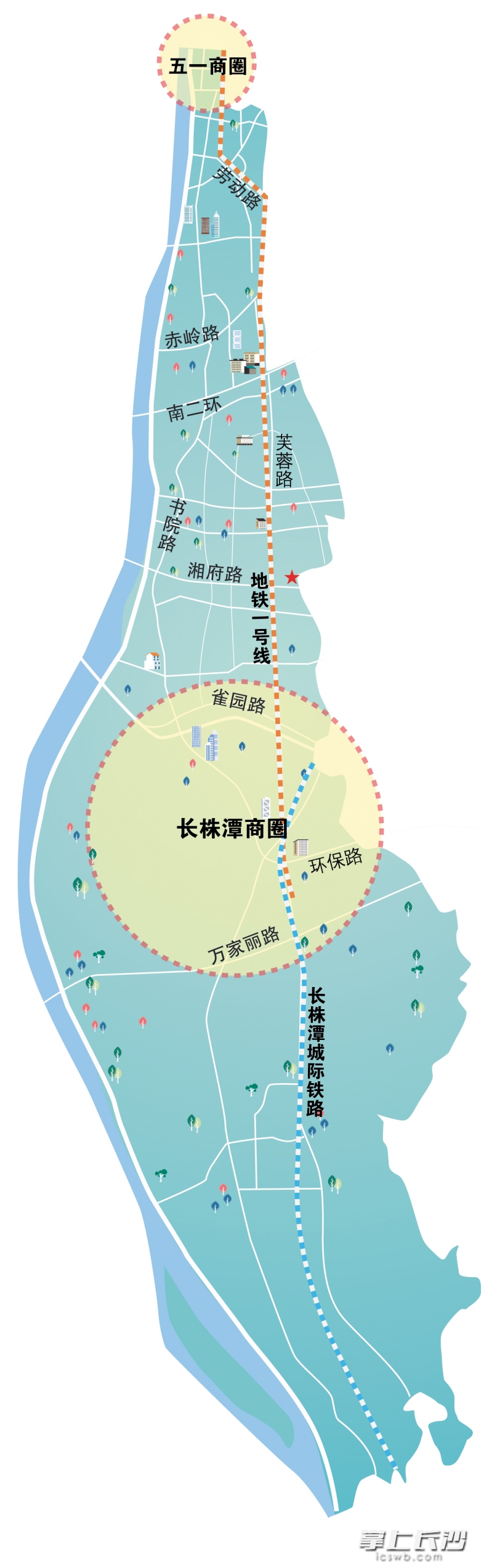 长株潭商圈的“命脉”,有多个“标签”。商圈位于湘江东岸天心区,地处长株潭城市群几何中心位置,是城市群融城核心区域。同时,作为长沙的南大门,长株潭商圈还是长株潭两型社会建设的前沿阵地。