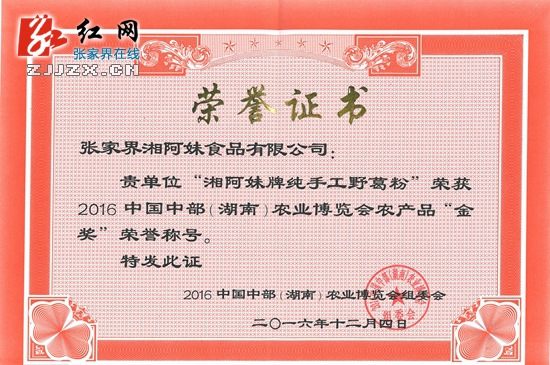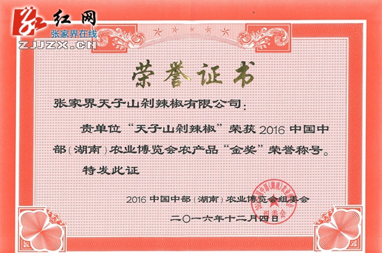 红网张家界分站12月5日讯(分站记者 文卓 通讯员 屈泽清 李祥富)12月5日,自湖南省张家界武陵源区农业部门传来喜讯,张家界天子山剁辣椒有限公司生产“天子山剁辣椒”、张家界湘阿妹食品有限公司生产“湘阿妹牌纯手工野葛粉”2个农产品荣获2016年中国中部(湖南)农博会金奖。